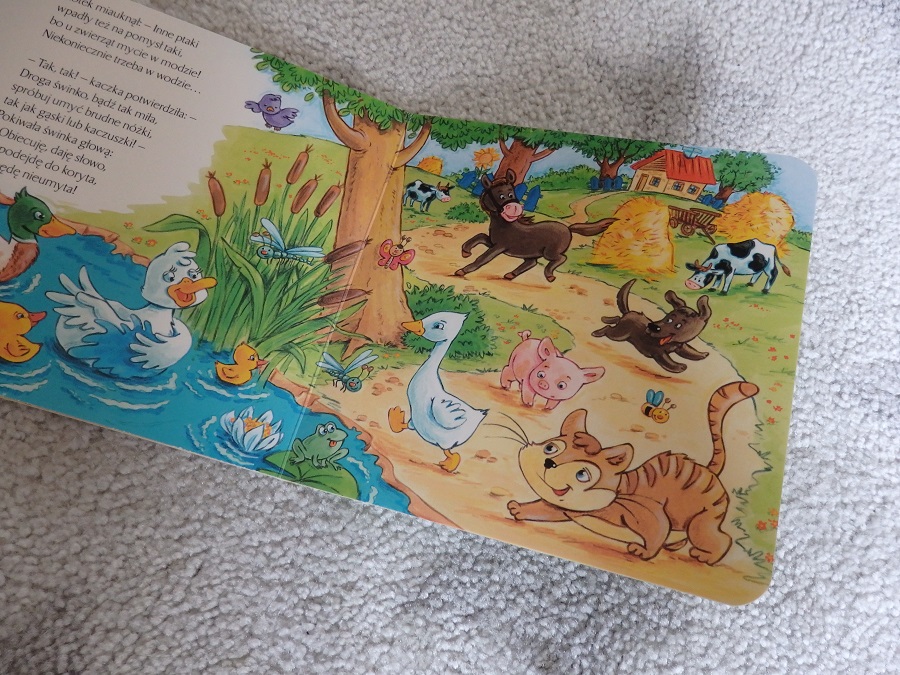 2. “Umyj się, świnko” – całkiem sympatyczna książeczka o śwince, która kąpać się nie chciała, ale namawiały ją do tego inne zwierzęta z podwórka: “Kura też ją prosi grzecznie: – Kąp się świnko, ko, ko-niecznie!”. Moim zdaniem to bardzo udana książeczka. Fajny, rytmiczny wierszyk Wiesława Drabika oraz ilustracje Agaty Nowak z całym mnóstwem zwierząt wiejskich tak bardzo lubianych przez maluchów. No i jest traktor, czyli jeden z najbardziej ulubionych pojazdów Małej Czytelniczki.