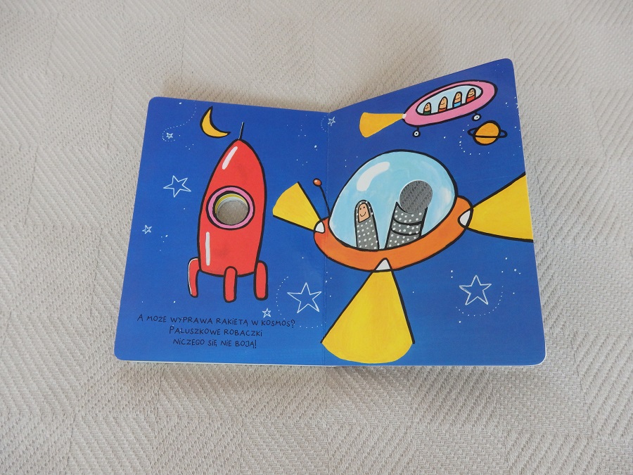Ideą książki jest stworzenie teatrzyku, wymalowanie na palcach oczu i buzi i poprzez grę aktorską wcielenie się w tytułowe robaczki. No i to zadanie okazuje się wcale nie tak proste jak by się wydawało. Książka daje tylko nieznaczne podpowiedzi w postaci scenerii i dwóch krótkich zdań-podpowiedzi. Natomiast stworzenie przekonującego i ciekawego przedstawienia zależy już od kreatywności rodzica. Dla mnie to zadanie okazało się wyjątkowo trudne i tylko umiarkowanie udało mi się przyciągnąć uwagę małego widza. Bardziej chyba podobało jej się, gdy wymalowałam uśmiechniętą buźkę na jej paluszku albo gdy przez dziury zaglądały różne zabawki.