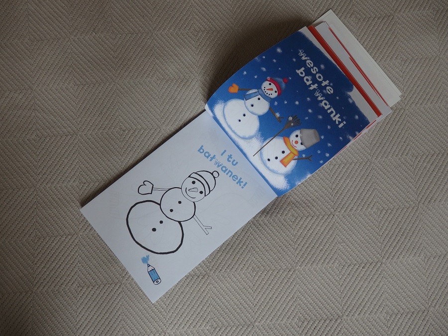 Wybór tematu okazał się strzałem w dziesiątkę, bo Mała Czytelniczka tęskni jeszcze za choinką i dekoracjami świątecznymi. Była niepocieszona, kiedy duży bałwanek zniknął z dekoracji klatki schodowej w żłobku. Codziennie o niego pyta i pamięta już odpowiedź, że wróci za rok. Kiedy zobaczyła więc bałwanki w kolorowance, tak się ucieszyła, że zaczęła się do nich przytulać.