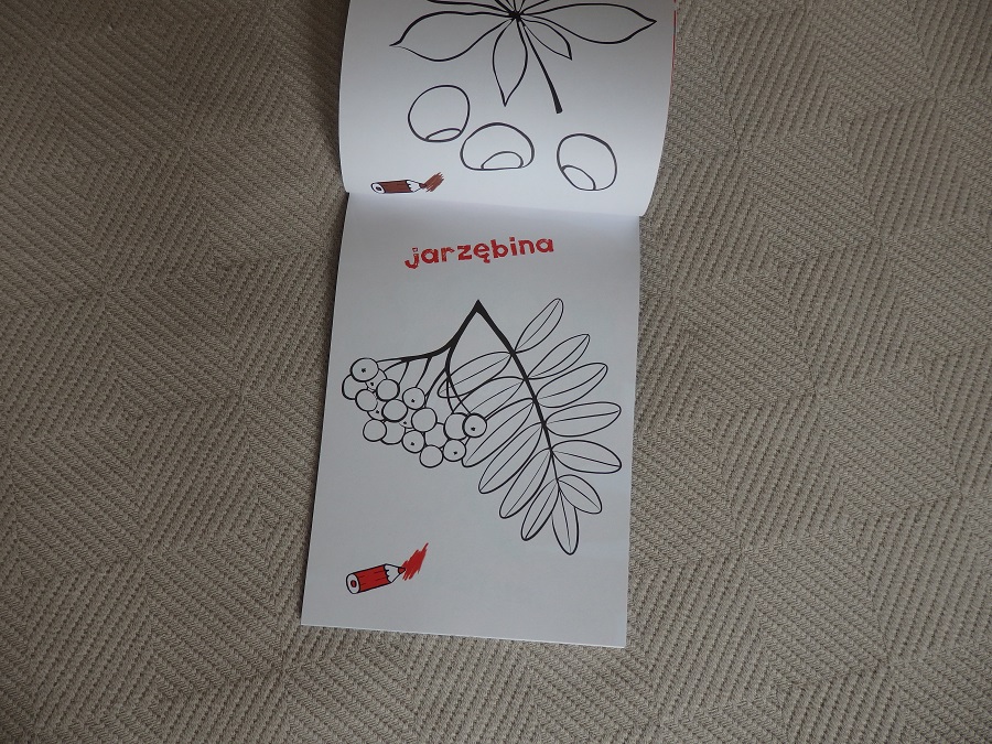 To co najbardziej podoba mi się w tym zeszycie, to proste i estetyczne kształty oraz urozmaicenia w postaci kolorowych stron i naklejek. Fajne jest też to, że na każdej stronie jest obrazkowa podpowiedź jakiego koloru kredki użyć. Mała Czytelniczka nie rozpoznaje jeszcze kolorów po nazwie, ale widząc obrazek z kredką, potrafi odnaleźć w pojemniku kredkę w tym samym kolorze.