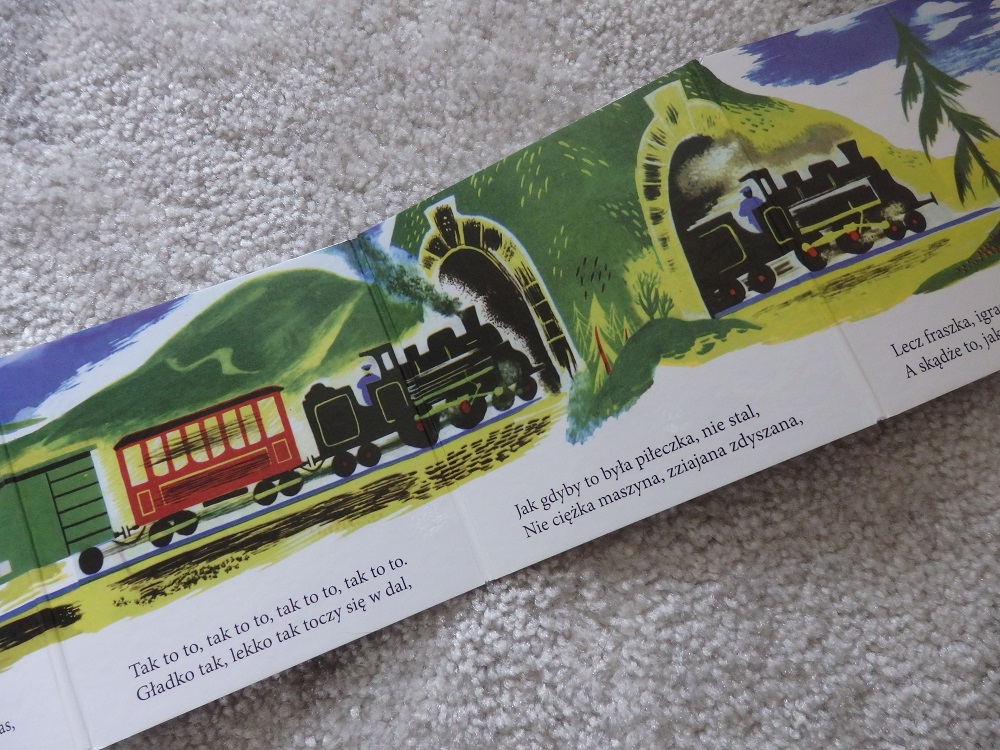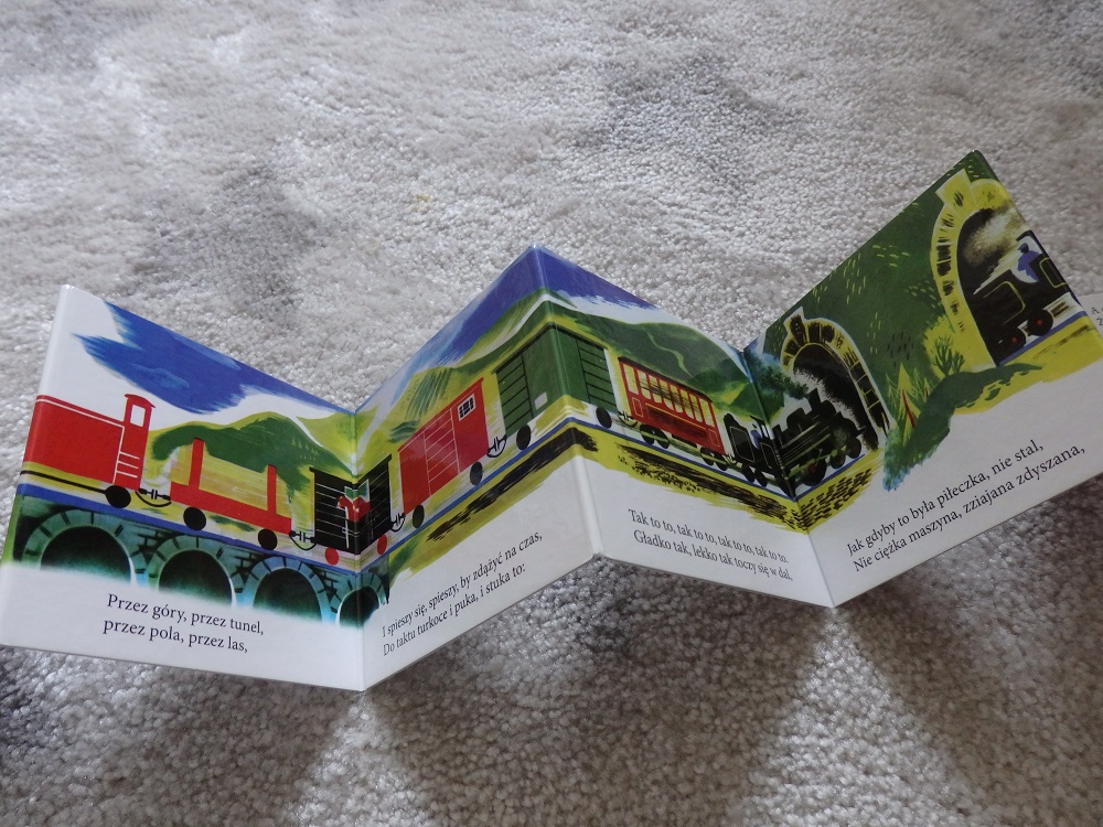 W tym wydaniu, które zakupiłam naprawdę super jest to, że jest to wersja rozkładana. Rozwijanie książki do harmonijki bardzo się podoba Małej Czytelniczce. Lubi sama się nią bawić, zwijać ją, rozwijać, przestawiać, rzucać. Czasem bawimy się tak, że rozłożoną książeczką jeździmy jak prawdziwą lokomotywą, która sapie “Ciuch, ciuch”. W tym wypadku bardzo to pasuje, bo dużą część książeczki po rozłożeniu (i to z obu stron) zajmuje obrazek lokomotywy. Więc zgrywa się to świetnie.