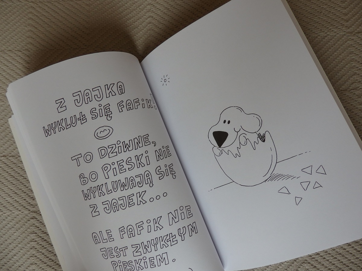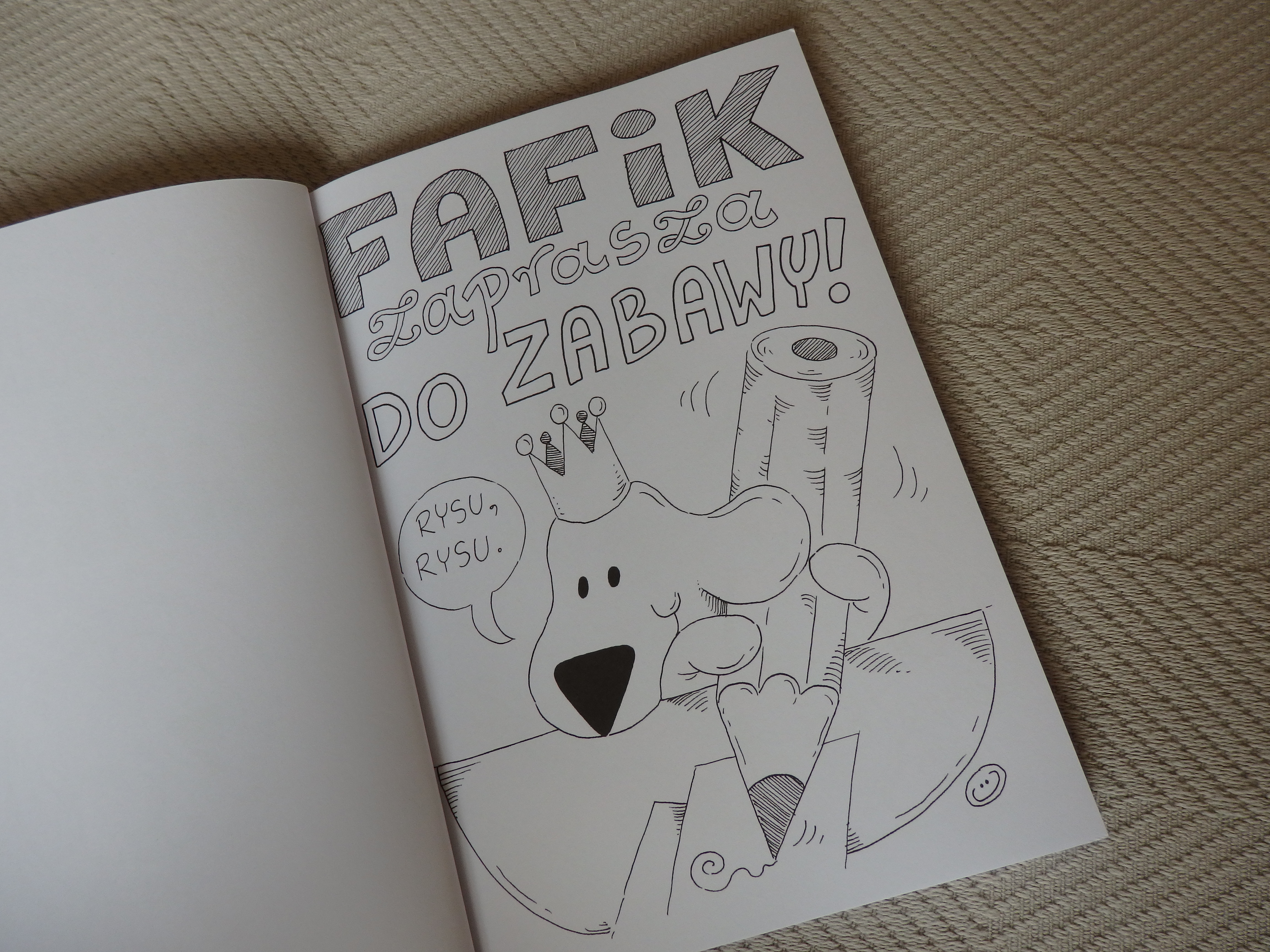 „Zaopiekuj się Fafikiem” to zeszyt zadań, ale różni się od innych tego typu pozycji. Przede wszystkim objętością – to nie jest kilka zszytych kartek, ale 144 strony pełne różnych aktywności, z których każde jest inne i jedyne w swoim rodzaju. Niektóre są zaskakującą wariacją powszechnie spotykanych zadań dla dzieci: „Te obrazki niczym się nie różnią. Dorysuj 10 różnic”, „Połącz kropki (jak chcesz)”. Wspólnym mianownikiem wielu zabaw jest konieczność uruchomienia wyobraźni: „Jak wyglądałaby planeta Fafika?”. Są też dosyć abstrakcyjne fragmenty, jak ten, gdzie Fafik wykluwa się z jajka. Oczywiście nie brakuje też zabaw, które edukują jak należy opiekować się pieskiem: „Zaplanuj idealny dzień dla pieska Fafika. Pamiętaj o kilku posiłkach, wodzie do picia, zabawie, spacerach, głaskaniu”. Przy tym wszystkim można się wyżyć mniej lub bardziej artystycznie: „Zaprojektuj dla Fafika ubranie na zimę”